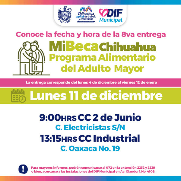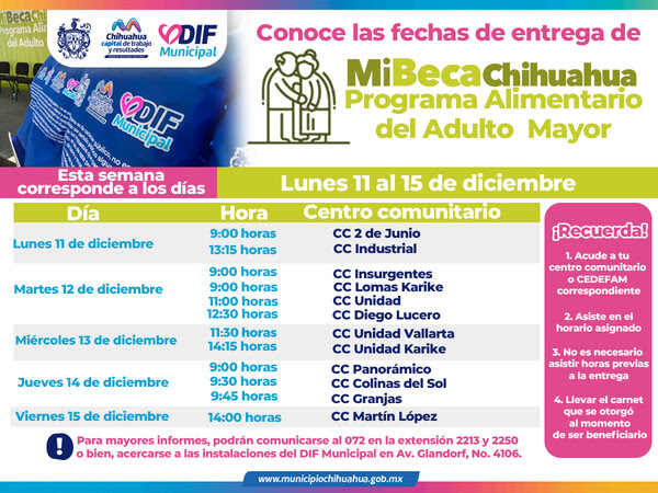 El Gobierno Municipal, a través del DIF, comunica que del 11 al 15 de diciembre, los beneficiarios del Programa Alimentario del Adulto Mayor (PAAM) podrán recoger su apoyo alimentario en diversos centros comunitarios. Esta iniciativa responde al compromiso del alcalde, Marco Bonilla, de mejorar la calidad de vida de los adultos mayores en Chihuahua Capital.
