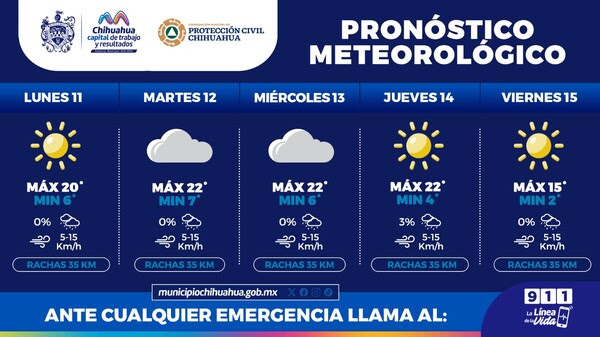 Según los datos proporcionados por el Servicio Meteorológico Nacional de CONAGUA, el lunes se anticipa una temperatura máxima de 20°C, con una mínima de 6°C y cielos mayormente despejados. Para el martes, se prevé una máxima de 22°C y una mínima de 7°C, con cielos mayormente nublados. El miércoles se espera una mínima de 6°C y una máxima de 22°C, con cielos parcialmente nublados. El jueves se pronostica una máxima de 24°C y una mínima de 4°C, con cielos soleados. Finalmente, el viernes se espera una temperatura máxima de 15°C y una mínima de 2°C, siendo este el día más frío de la semana.