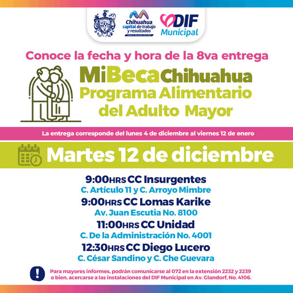 El Gobierno Municipal de Chihuahua Capital, a través del DIF, informa a la comunidad sobre la entrega de apoyos alimentarios del Programa Alimentario del Adulto Mayor (PAAM) este martes, 12 de diciembre, en varios centros comunitarios: