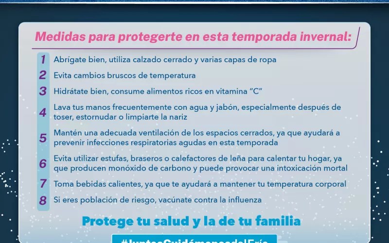 Barrios destacó que este patrón se repite cada año al comenzar la temporada invernal. Recomendó a la población tomar medidas preventivas, ya que estas enfermedades se transmiten por contacto directo entre personas. Hizo un llamado a abrigarse adecuadamente, evitar cambios bruscos de temperatura, tomar precauciones en lugares concurridos y usar cubrebocas para prevenir contagios propios y ajenos.