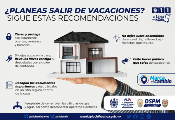 Debido a las vacaciones de diciembre y la salida de muchas personas para vacacionar, la Dirección de Seguridad Pública del Gobierno Municipal emite recomendaciones para ayudar a los residentes de Chihuahua a prevenir robos y otros delitos en sus hogares cuando se encuentren solos.
