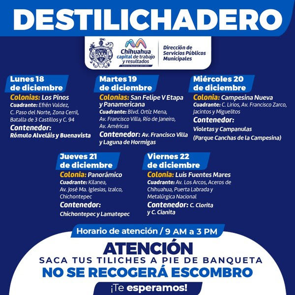 El Gobierno Municipal, a través de la Dirección de Servicios Públicos Municipales, ha anunciado el calendario del programa Destilichadero, que se llevará a cabo del 18 al 22 de diciembre en seis colonias de la Capital.
