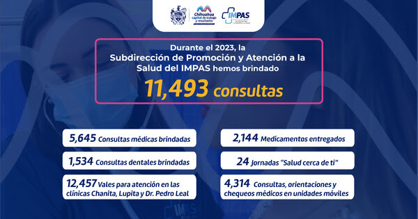 Durante el año 2023, el Gobierno Municipal, a través del Instituto Municipal de Prevención y Atención a la Salud (IMPAS), continuó proporcionando servicios médicos a la comunidad. En este periodo, se llevaron a cabo un total de 11,493 consultas bajo la supervisión de la Subdirección de Promoción y Atención a la Salud.