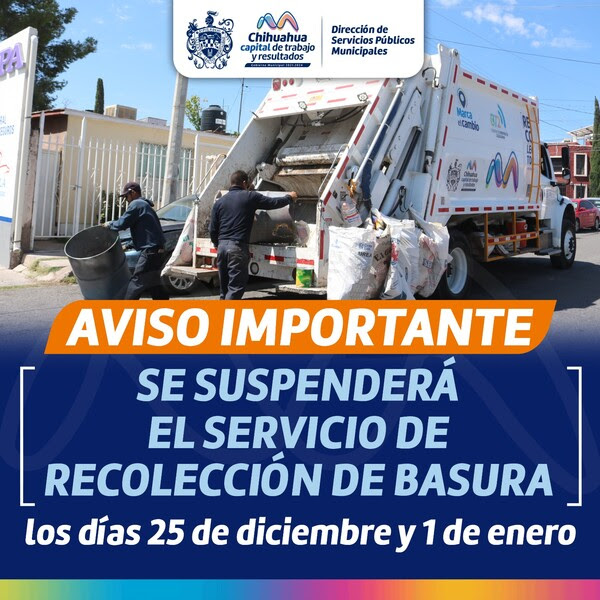 Con motivo de las festividades de diciembre, queremos informar a todos los ciudadanos que el servicio de recolección de basura se suspenderá los días 25 de diciembre y 1 de enero, ya que son días festivos. Pedimos a la comunidad que tome las precauciones necesarias durante estos días en los que el servicio estará interrumpido.