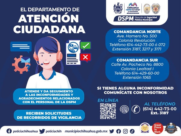 La Dirección de Seguridad Pública Municipal (DSPM) de Chihuahua ha implementado una nueva iniciativa para que los ciudadanos puedan expresar sus opiniones sobre los elementos de la policía y bomberos. A través del departamento de Atención Ciudadana, se ha creado un código QR y enlace que permiten a la comunidad compartir quejas, felicitaciones o agradecimientos.