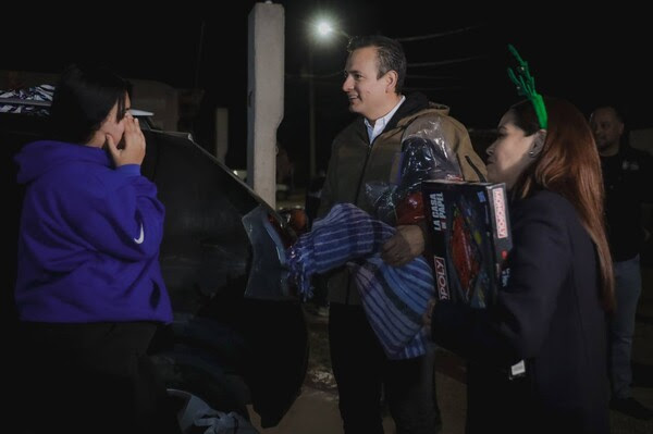 En la víspera de Navidad, el alcalde Marco Bonilla y la presidenta del DIF Municipal, Karina Olivas, llevaron un poco de alegría a los residentes de la colonia 11 de Febrero mediante cenas navideñas.