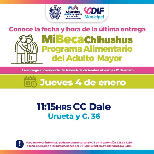 El Gobierno Municipal, a través del DIF, informa que, en cumplimiento del compromiso del alcalde Marco Bonilla con los adultos mayores de Chihuahua Capital, se llevará a cabo la entrega del apoyo alimentario del Programa Alimentario del Adulto Mayor (PAAM) este jueves 4 de enero en el centro comunitario Dale, a las 11:15 am.
