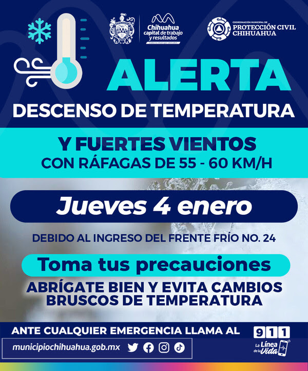 La Coordinación Municipal de Protección Civil informa a la ciudadanía sobre las condiciones climáticas para el jueves 4 de enero. Se esperan ráfagas de viento de 55-60 kilómetros por hora, según el Sistema Meteorológico Nacional de la CONAGUA, debido al ingreso del Frente Frío número 24.