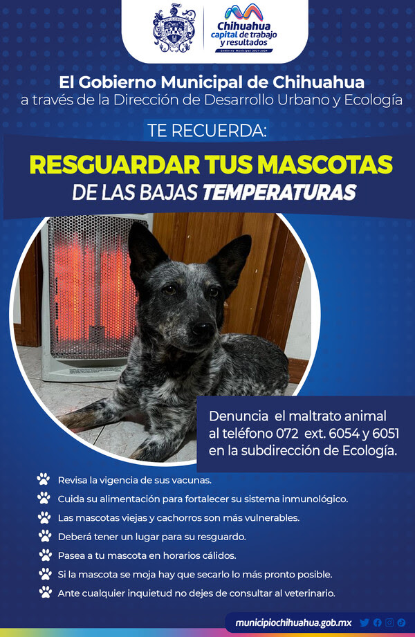 La Administración Municipal de Chihuahua, a través de la Dirección de Desarrollo Urbano y Ecología, destaca la importancia de cuidar a las mascotas ante las bajas temperaturas que persisten en la capital. Se enfatiza que durante la temporada invernal, los cambios de temperatura son notables y pueden afectar a los animales si no reciben el cuidado adecuado.