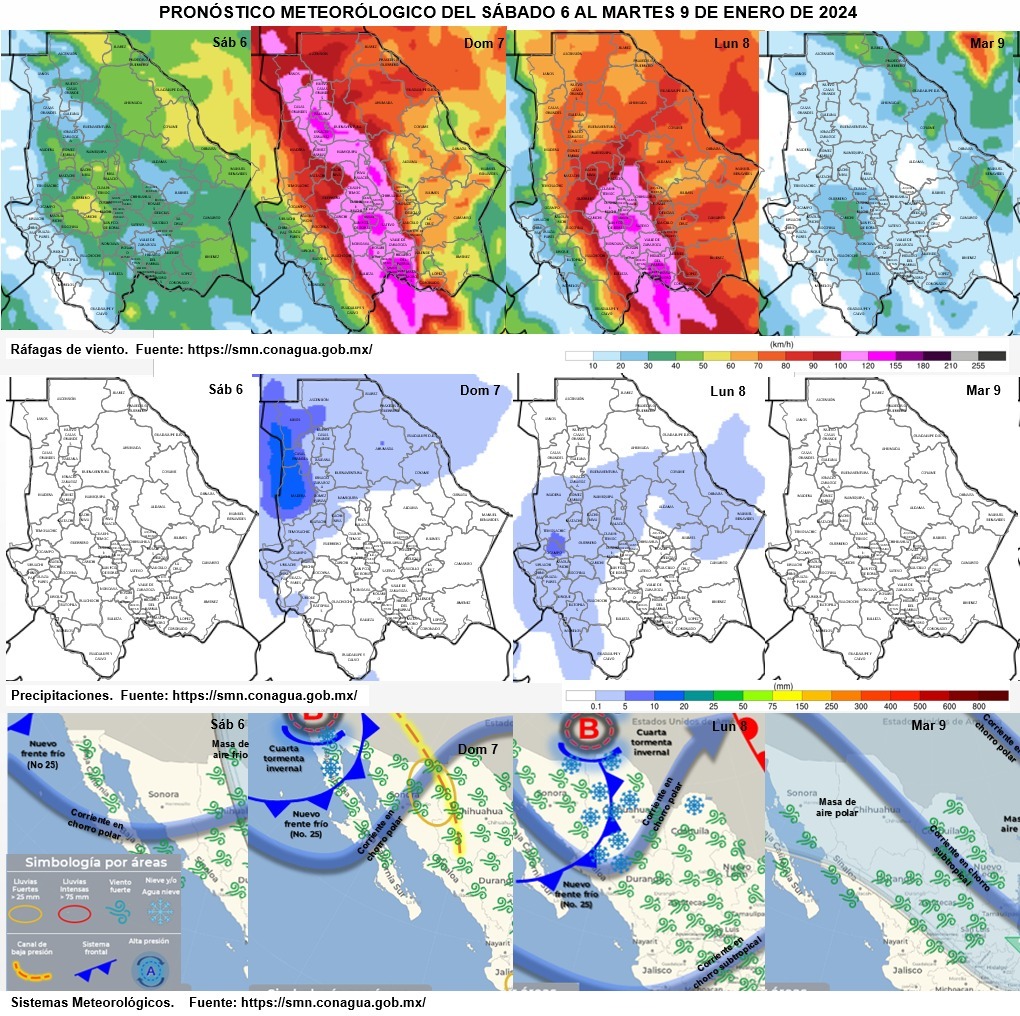 Las ráfagas de viento podrían superar los 55 km/h en los municipios de Juárez, Guadalupe, Ascensión, Cusihuiriachi, Cuauhtémoc, Riva Palacio y Chihuahua (Majalca). El domingo, la llegada del frente frío número 25 y la Cuarta Tormenta Invernal traerán consigo ráfagas que podrían superar los 85 km/h en diversas localidades, incluyendo Casas Grandes, Galeana, Ignacio Zaragoza, Buenaventura, Namiquipa, Carichí, Nonoava, Balleza, San Francisco de Borja, Cusihuiriachi, Cuauhtémoc, Riva Palacio, Chihuahua, Satevó, Parral y Santa Bárbara.