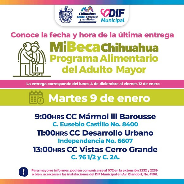 El Gobierno Municipal, a través del DIF, informa a los beneficiarios del Programa Alimentario del Adulto Mayor (PAAM) en Chihuahua Capital sobre la entrega de apoyos este martes 9 de enero. Los lugares y horarios son: