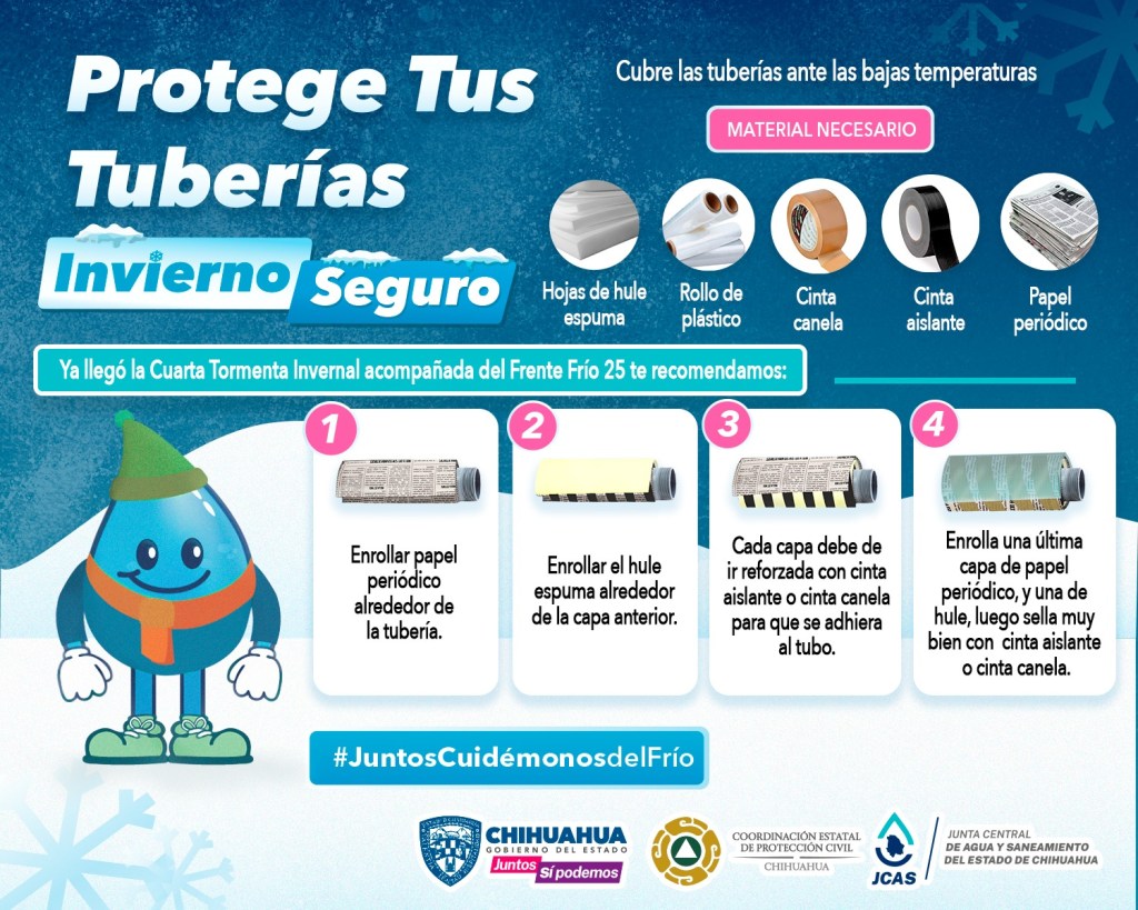 La Junta Central de Agua y Saneamiento (JCAS) ha reafirmado su llamado a la población para que tome medidas preventivas y evite posibles inconvenientes derivados de las bajas temperaturas, en medio de la llegada de la Cuarta Tormenta Invernal y el frente frío número 25 al territorio estatal.