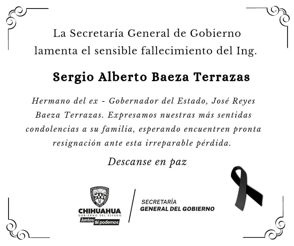 Enviamos nuestras más sinceras condolencias al Lic. José Reyes Baeza Terrazas, así como a toda la familia Baeza Terrazas, en este difícil momento. Esperamos que encuentren pronta resignación ante la irreparable pérdida.