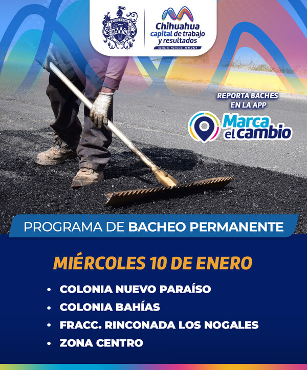 Para dar continuidad al mantenimiento de calles y avenidas, el Gobierno Municipal realizará trabajos de bacheo hoy, 10 de enero, en las colonias Nuevo Paraíso, Bahías, fraccionamiento Rinconada Los Nogales y en la Zona Centro.