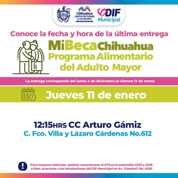 El Gobierno Municipal, a través del DIF, quiere informar a los beneficiarios del Programa Alimentario del Adulto Mayor (PAAM) que este jueves 11 de enero podrán recoger su apoyo alimentario en el centro comunitario Arturo Gámiz a las 12:15 pm.