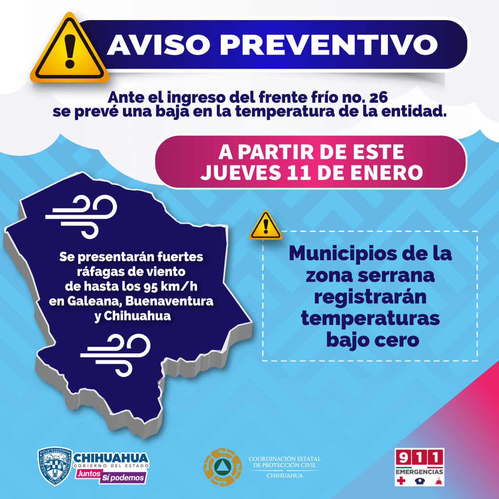 Adicionalmente, se espera la caída de lluvia, nieve y agua nieve en las partes altas de la sierra durante la noche del jueves 11 y madrugada del viernes 12 de enero. Se anticipa un marcado descenso de temperatura en diversas localidades, con mínimas de 0°C en Chihuahua, -3°C en Juárez, -8°C en Madera, -3°C en Cuauhtémoc, 0°C en Delicias y 1°C en Parral.