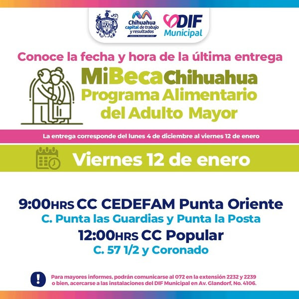 Con el objetivo de mejorar la calidad de vida de las personas mayores, el DIF Municipal informa que este viernes 12 de enero, los beneficiarios del Programa Alimentario del Adulto Mayor (PAAM) pueden recoger su apoyo alimentario en los siguientes centros comunitarios: