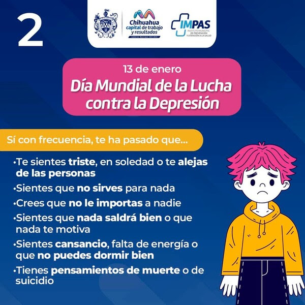 El Gobierno Municipal de Chihuahua, a través del Instituto Municipal de Prevención y Atención a la Salud (IMPAS), comparte información esencial para que estemos alerta y podamos reconocer las señales que podrían indicar la presencia de depresión en nosotros mismos o en otras personas.