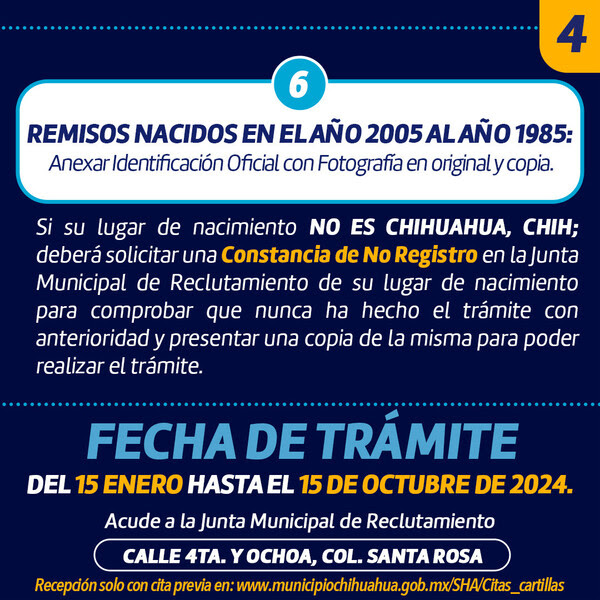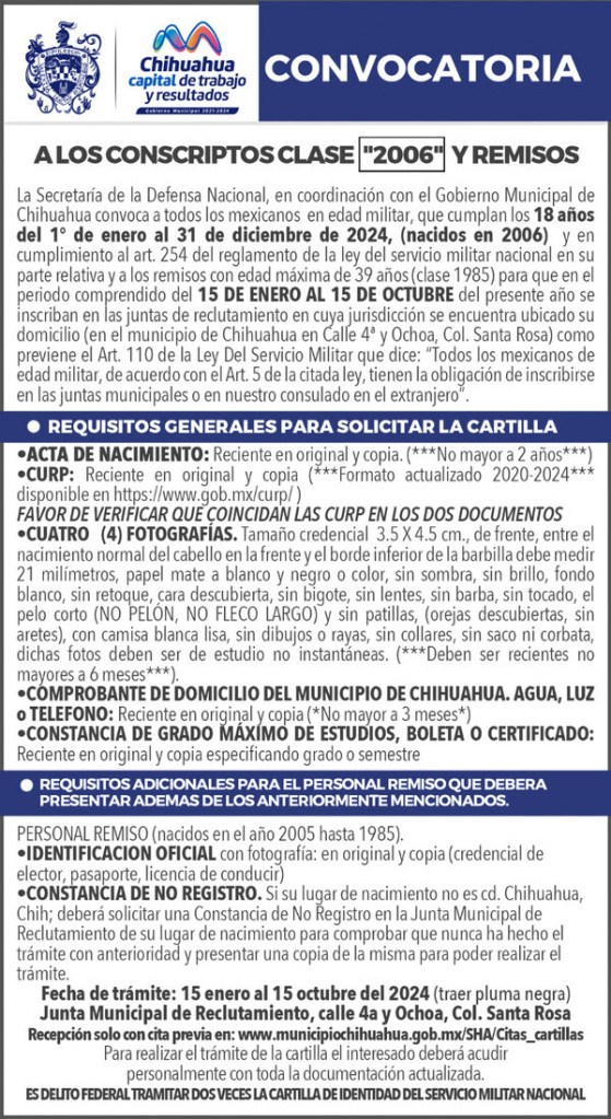 La Secretaría de la Defensa Nacional (SEDENA) y el Gobierno Municipal de Chihuahua están llamando a los ciudadanos de Chihuahua que cumplen con los requisitos militares. Esto incluye a aquellos que cumplirán 18 años entre el 1 de enero y el 31 de diciembre de 2024 (nacidos en 2006) y a los remisos con una edad máxima de 39 años (clase 1985). De acuerdo con el artículo 254 de la Ley del Servicio Militar Nacional, se solicita a los interesados que se inscriban en las juntas de reclutamiento ubicadas entre las calles Cuarta y Ochoa, colonia Santa Rosa, desde el 15 de enero hasta el 15 de octubre del presente año.