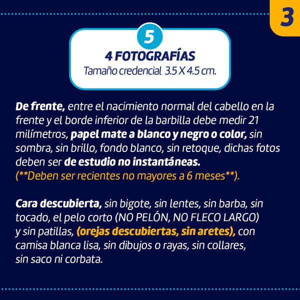 - Cuatro fotografías (tamaño credencial 3.5 x 4.5cm, revisar especificaciones completas).