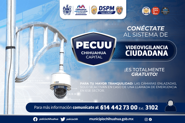 Con el fin de ampliar la cobertura de vigilancia preventiva en la ciudad, la Dirección de Seguridad Pública Municipal (DSPM) hace un llamado a los ciudadanos que dispongan de sistemas de videograbación en sus hogares, negocios o escuelas a unirse a la Plataforma Escudo Chihuahua Capital (PECUU), con el objetivo de contribuir a la seguridad de las familias de la Capital.