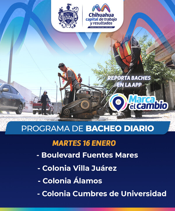 El alcalde Marco Bonilla, al frente del Gobierno Municipal, continúa con las labores de reparación de baches en el boulevard Fuentes Mares y en las colonias Villa Juárez, Álamos y Cumbres de Universidad. Esto responde a los informes diarios de los ciudadanos a través de diferentes canales de comunicación, como el Centro de Respuesta Ciudadana (CRC) y la aplicación Marca el Cambio.