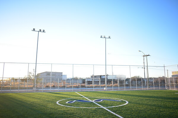 Para garantizar la seguridad del área, se erigió una malla ciclónica de cuatro metros de altura alrededor de la cancha. Además, se llevó a cabo el suministro y la instalación de un sistema eléctrico para la iluminación mediante reflectores de tecnología LED.