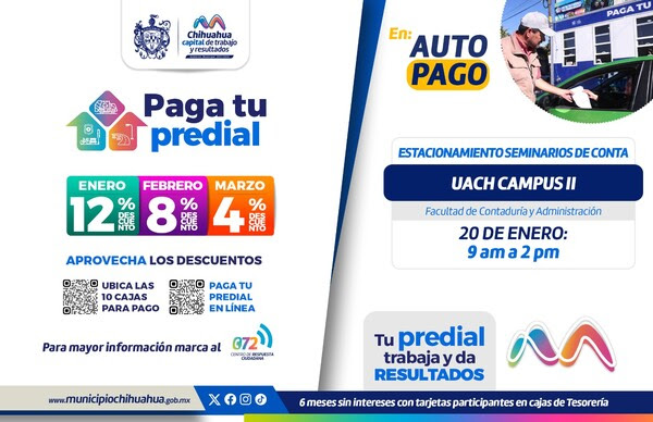 El Gobierno Municipal de Chihuahua invita a la comunidad a aprovechar un descuento del 12% en el pago del impuesto predial. Esta oferta estará disponible este sábado 22 de enero, de 9:00 a.m. a 2:00 p.m., en el servicio de autopago ubicado en el estacionamiento de Seminarios de la Facultad de Contaduría y Administración de la Universidad Autónoma de Chihuahua.