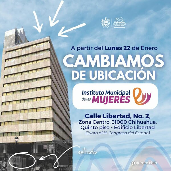 La Administración Municipal de Chihuahua desea informar a todas las mujeres de la capital que a partir del próximo lunes 22 de enero, el Instituto Municipal de las Mujeres (IMM) mudará sus oficinas al quinto piso del Edificio Libertad, ubicado en la calle Libertad número 2, en la Zona Centro, justo en frente de la Presidencia Municipal.