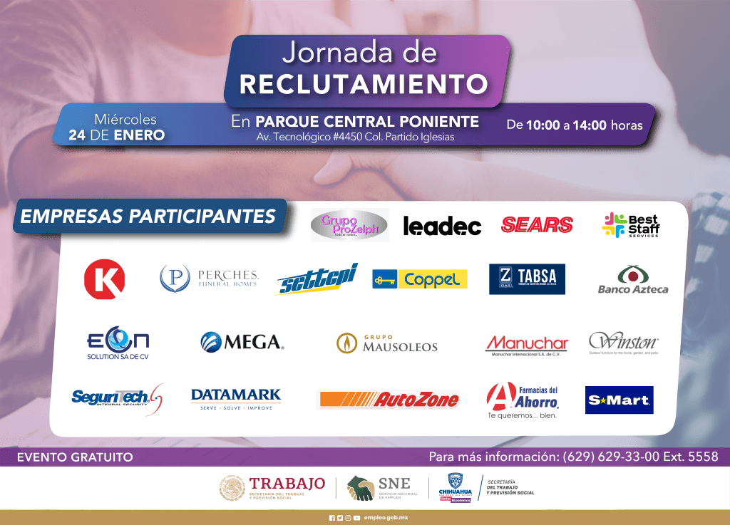 La Secretaría del Trabajo y Previsión Social (STPS), a través del Servicio Estatal de Empleo (SEE), realizará este miércoles 24 de enero la primera Jornada de Reclutamiento de 2024 en Ciudad Juárez. En este evento participarán 25 empresas, ofreciendo un total de 500 empleos.