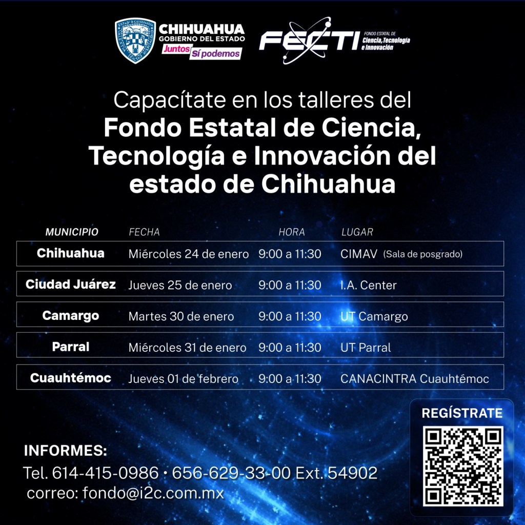 El Instituto de Innovación y Competitividad (I2C) invita a los talleres que ofrecerán información detallada sobre las reglas de operación y los proyectos elegibles en las actuales convocatorias del Fondo Estatal de Ciencia, Tecnología e Innovación (FECTI). Estos talleres se llevarán a cabo en diversas ubicaciones, incluyendo Chihuahua, Juárez, Camargo, Delicias, Parral y Cuauhtémoc.