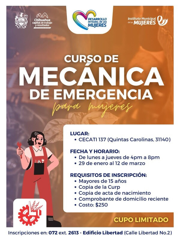 El Gobierno Municipal, a través del Instituto Municipal de las Mujeres (IMM) y del Departamento Desarrollo Integral de la Mujer (DIM), hace una cordial invitación a las mujeres de Chihuahua Capital para que participen en un curso de mecánica de emergencias.