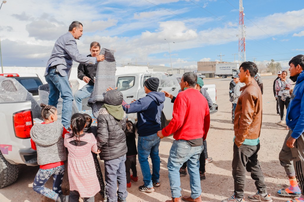 El equipo de la Secretaría de Desarrollo Humano y Bien Común (SDHyBC) entregó diversos apoyos a las familias de migrantes que se encuentran asentadas temporalmente en un lugar al sur de la ciudad de Chihuahua. La titular de la dependencia, Carla Rivas, informó que distribuyeron 150 cobijas, las cuales serán de gran ayuda frente a los cambios bruscos de temperatura durante la temporada invernal, además de 200 botellas de agua purificada de 500 mililitros.