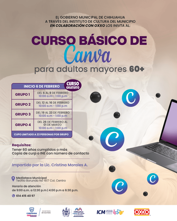 Es necesario tener 60 años o más para participar. Para obtener más información o registrarse, se puede llamar al número 614-415-40-97 o visitar la Mediateca Municipal en la calle Teófilo Borunda número 1617, colonia Centro, en horario de atención de 9:00 am a 12:30 pm y de 4:00 a 6:30 pm.