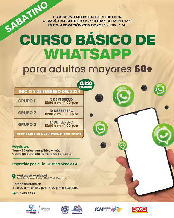 El curso de WhatsApp se llevará a cabo los sábados 3, 10 y 17 de febrero, de 10:00 am a 1:00 pm. El curso básico de computación comenzará el martes 6 de febrero, con un cupo limitado de 23 personas, de 9:30 a 11:00 am. Asimismo, el curso de Canva se dividirá en cuatro grupos, con fechas de inicio el 6, 12, 19 y 26 de febrero.