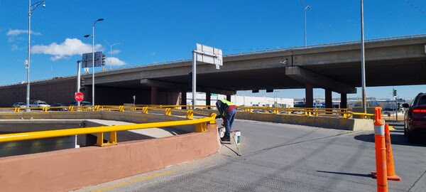 Los trabajos abarcaron la pintura de los muros de contención del bajo puente, así como los barandales metálicos y muros en la parte superior de la intersección. En total, se han pintado más de 1,400 metros lineales de barandillas y muros, con un consumo de más de 268 litros de pintura.