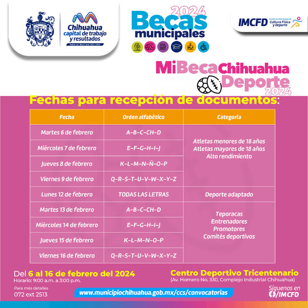 Según el calendario establecido en las bases de la convocatoria, las solicitudes se recibirán del 6 al 16 de febrero en el centro deportivo Tricentenario, ubicado en la avenida Homero #330, Complejo Industrial Chihuahua, en horario de 9:00 am a 3:00 pm.