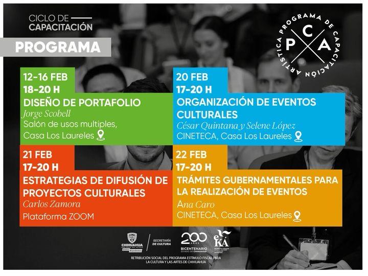 La Secretaría de Cultura, a través del Programa de Capacitaciones Artísticas (PCA), invita a la comunidad artística y cultural a participar en una serie de talleres gratuitos que se llevarán a cabo en Chihuahua a partir del 12 de febrero en la Casa Los Laureles.