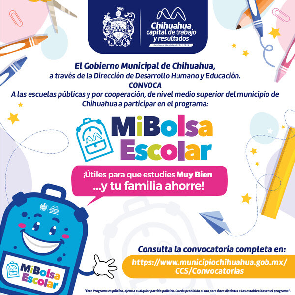 La directora de Desarrollo Humano y Educación, Mónica Herrera, también anunció la convocatoria para el programa «Mi Bolsa Escolar», dirigido a las escuelas de nivel medio superior. Para ser elegible, se requiere un registro previo del 6 al 14 de febrero de 2024, en las instalaciones de la Dirección de Desarrollo Humano y Educación, ubicada en la Calle Ojinaga No. 300, Colonia Centro, segundo piso, Departamento de Infraestructura Educativa, en un horario de lunes a viernes de 9:00 a 15:30 horas.