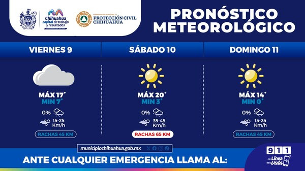 La Coordinación Municipal de Protección Civil informa que este fin de semana, del 9 al 12 de febrero, se esperan temperaturas máximas de 20°C y mínimas de 0°C, junto con fuertes vientos. Se insta a la población a seguir las recomendaciones de las autoridades para evitar problemas de salud.