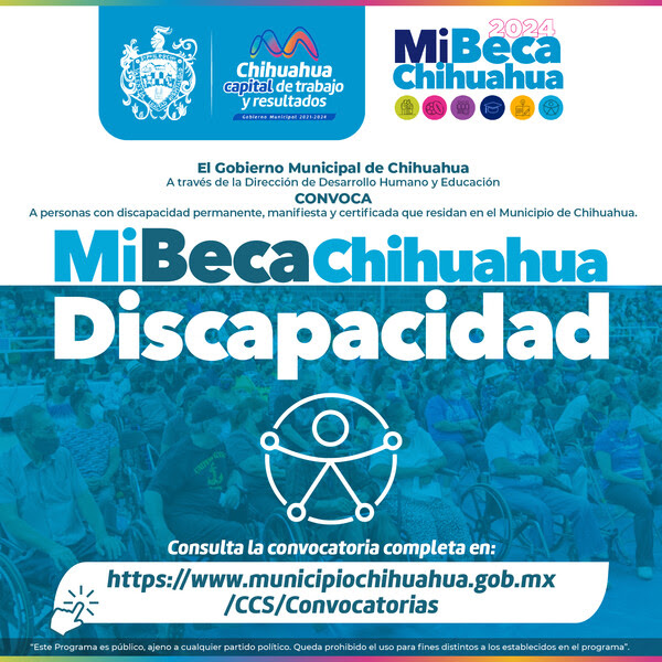 Con el fin de apoyar a las personas con discapacidad permanente y certificada, el Gobierno Municipal, a través de la Dirección de Desarrollo Humano y Educación, anuncia la apertura del registro para el programa «Mi Beca Chihuahua Discapacidad», que estará disponible del 12 al 23 de febrero.