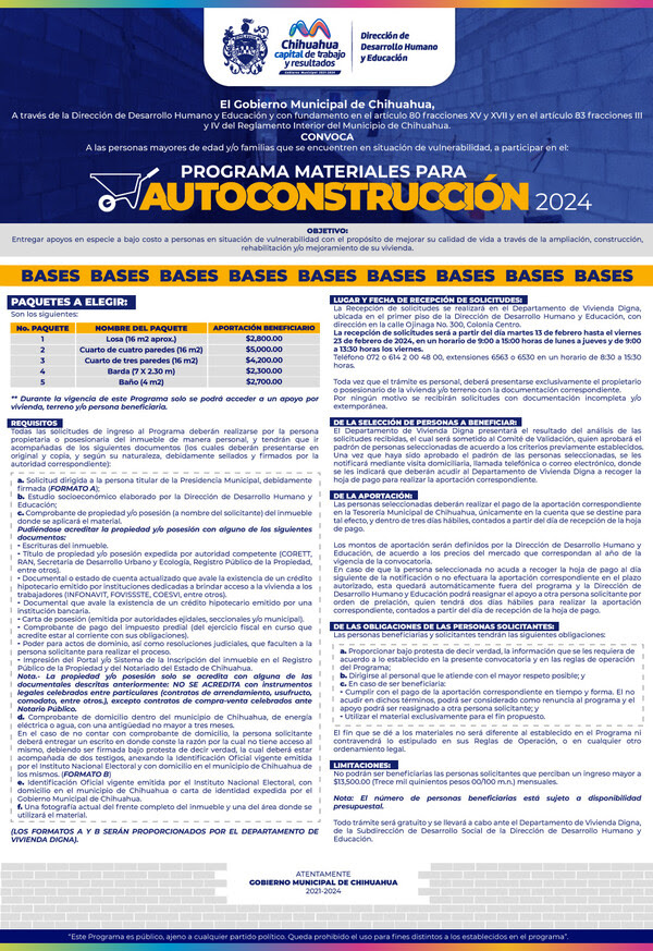 Las solicitudes se reciben en el Departamento de Vivienda Digna, ubicado en el primer piso de la Dirección de Desarrollo Humano y Educación en la calle Ojinaga número 300, colonia Centro.