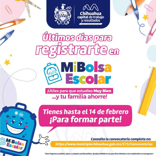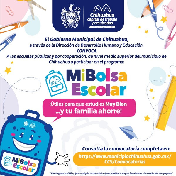 El Gobierno Municipal de Chihuahua, a través de la Dirección de Desarrollo Humano y Educación, está promoviendo el programa «Mi Bolsa Escolar» con el fin de apoyar económicamente a las familias de Chihuahua Capital. Este programa está dirigido a escuelas públicas y por cooperación de nivel medio superior del municipio, ofreciendo la entrega de mochilas a los estudiantes beneficiados según las solicitudes recibidas.
