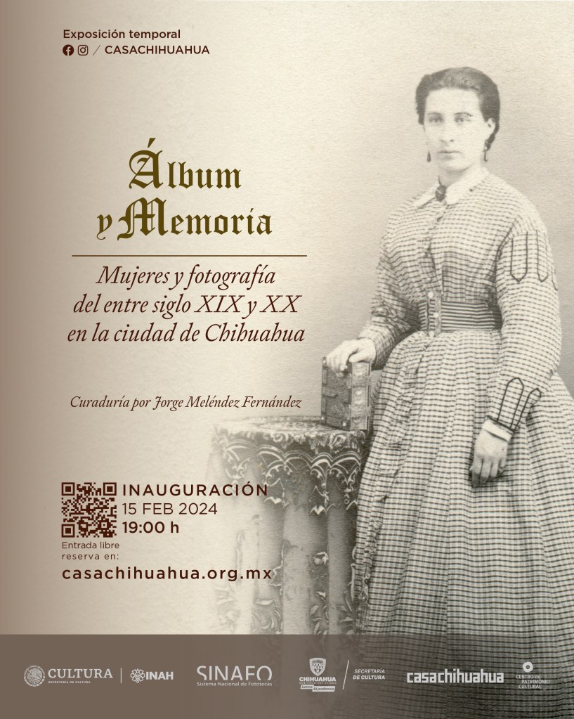 La Casa Chihuahua Centro de Patrimonio Cultural y la Fototeca INAH Chihuahua tienen el placer de anunciar una nueva exposición temporal titulada «Álbum y Memoria: Mujeres y Fotografía entre los Siglos XIX y XX en la Ciudad de Chihuahua», que se inaugura el jueves 15 de febrero a las 19:00 horas.