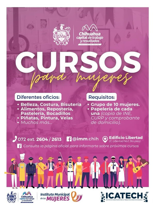 En este encuentro, las participantes podrán obtener información sobre diversos cursos en oficios disponibles, así como realizar gestiones, recibir orientación jurídica, conocer detalles sobre la tarjeta “Juntas Podemos Ahorrar” y explorar los cursos de capacitación para el empleo en colaboración con el Instituto de Capacitación para el Trabajo del Estado de Chihuahua (ICATECH).