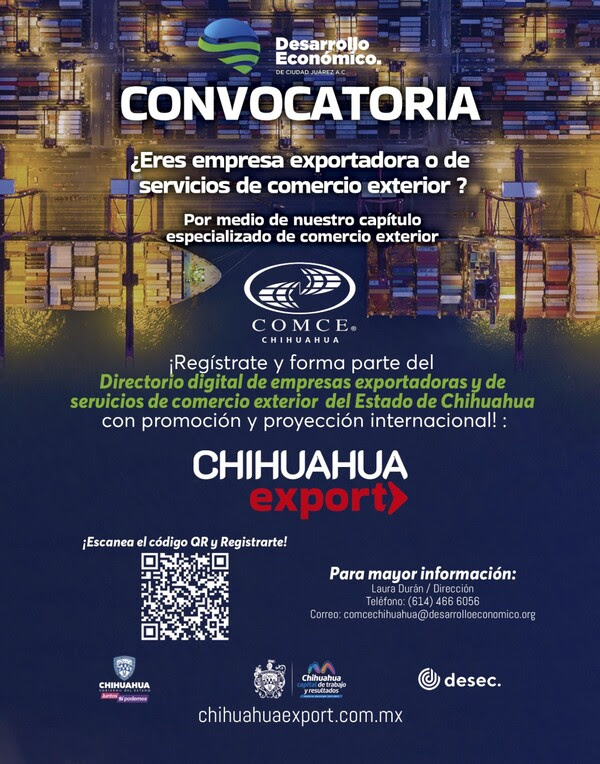 El Gobierno Municipal de Chihuahua te invita cordialmente a participar de manera gratuita en una convocatoria dirigida a empresas exportadoras o de servicios de comercio exterior. El propósito es crear un Directorio Digital Exclusivo de Empresas Chihuahuenses, con el fin de promoverlas y posicionarlas en diferentes partes del mundo.