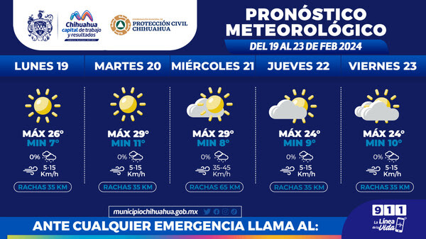 Según el Servicio Meteorológico Nacional de CONAGUA, el lunes se espera una máxima de 27°C y una mínima de 7°C, con cielo despejado. El martes, se prevé una máxima de 29°C y mínima de 11°C, con cielo soleado. El miércoles, se anticipa una mínima de 8°C y una máxima de 29°C, con cielo mayormente despejado. El jueves, se espera una máxima de 24°C y mínima de 9°C, con cielo parcialmente nublado, mientras que el viernes se pronostica una máxima de 24°C y mínima de 10°C, con cielo mayormente nublado.