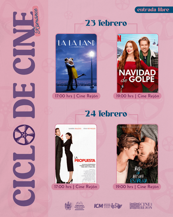 El Instituto de Cultura del Municipio, en colaboración con el Gobierno Municipal, te invita a disfrutar del «Ciclo de Cine Romántico» este 23 y 24 de febrero en el Cine del Rejón. Prepárate para ser cautivado por películas que llegarán directo al corazón de todos los espectadores.