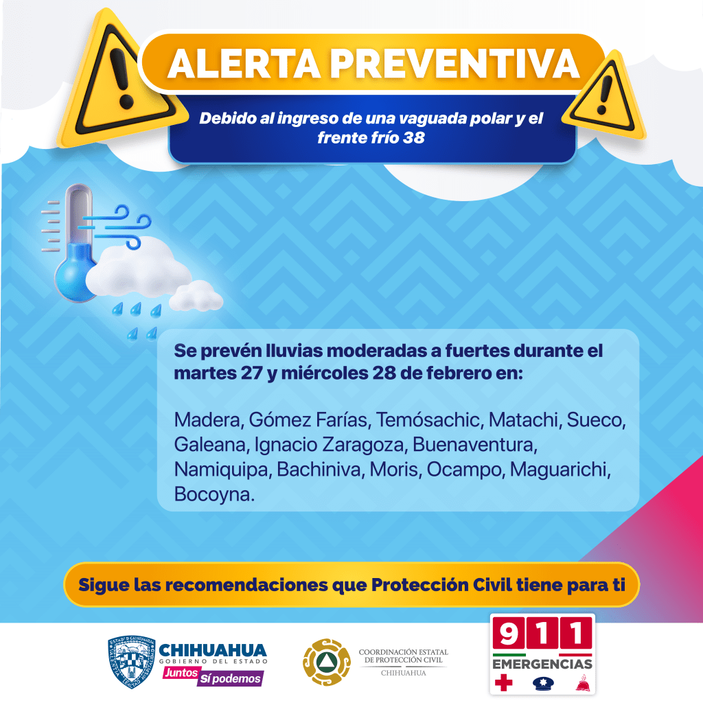 La Coordinación Estatal de Protección Civil (CEPC) ha comunicado que se mantiene una alerta preventiva en la región debido a la presencia de vientos fuertes y lluvias, previstas para las próximas horas. Esto se debe a la aproximación del frente frío número 38 al noroeste del país y al desplazamiento de una vaguada polar, que interactúa con la corriente en chorro, generando un ambiente caluroso durante la tarde y cielos parcialmente nublados a nublados en la mayor parte del territorio.