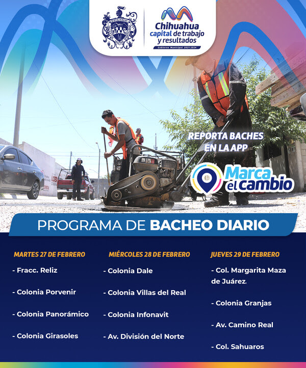 Se recuerda a los ciudadanos que pueden informar sobre baches a través del Centro de Respuesta Ciudadana llamando al 072 o utilizando la aplicación gratuita Marca el Cambio, disponible en dispositivos móviles iOS y Android.